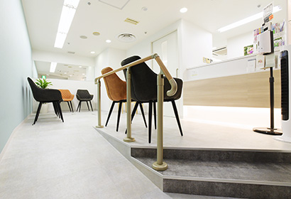 ミントグリーンの壁が良いアクセントになり、二色のイスを配置することにより、開放的でおしゃれな空間を演出できました。待合室でもリラックスして寛いでいただければ何よりです。